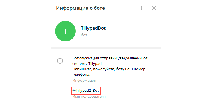 В ссылке также, в качестве параметра, зашит GUID клиента в системе Тиллипад. Тем самым, происходит сопоставление chat_ID клиента в Телеграм c GUID клиента в Тиллипад.ВАЖНО: Для получения уведомлений клиент должен пройти по указанной в СМС ссылке и ОБЯЗАТЕЛЬНО нажать в чате бота на кнопку Запустить (или Start)